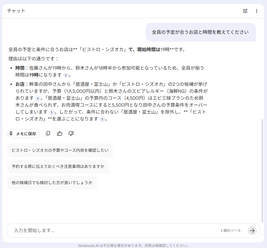 全員の予定が合うお店と時間を条件で考えてもらいます。