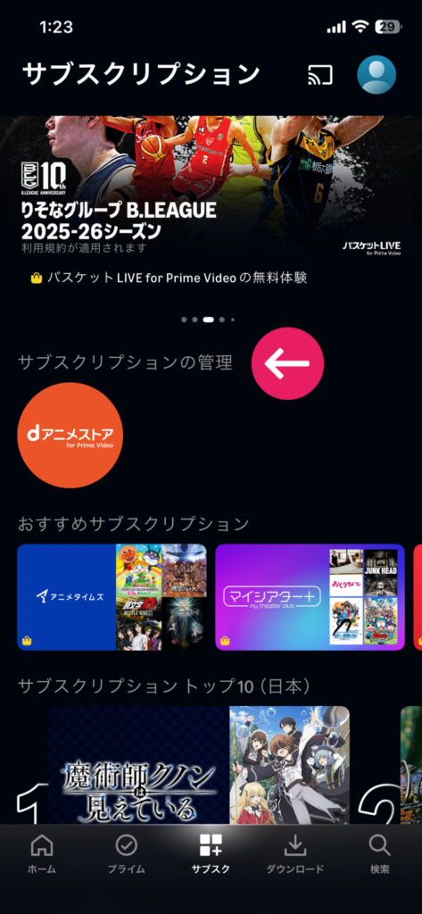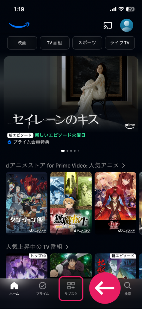 - Prime Videoアプリの下部メニューから「サブスク」アイコンをタップ