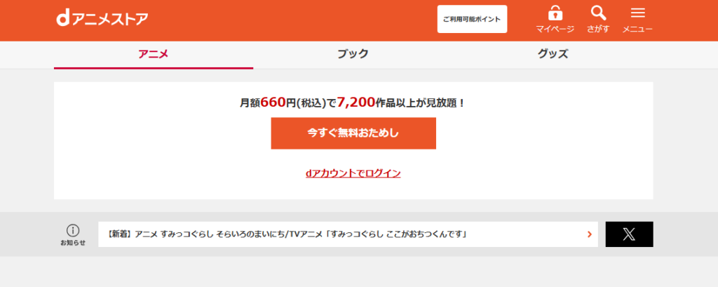 | dアニメストア | 660円 | 7,200作品以上 | 31日間 |
