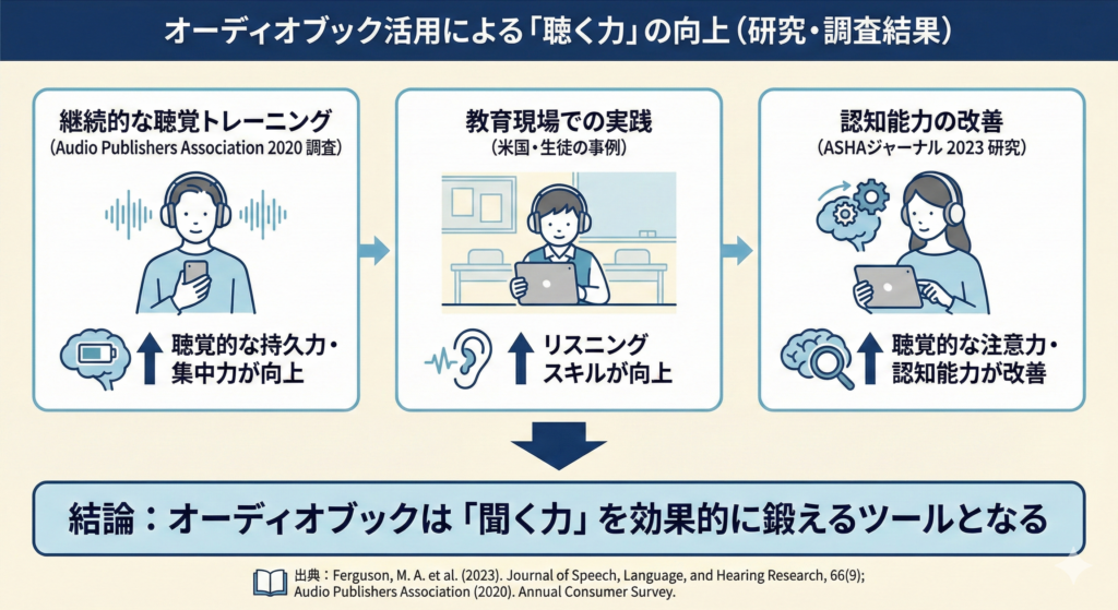 | 4 | 「聞く力」の持続力が鍛えられる | Audio Publishers Association / Ferguson et al. (2023) |