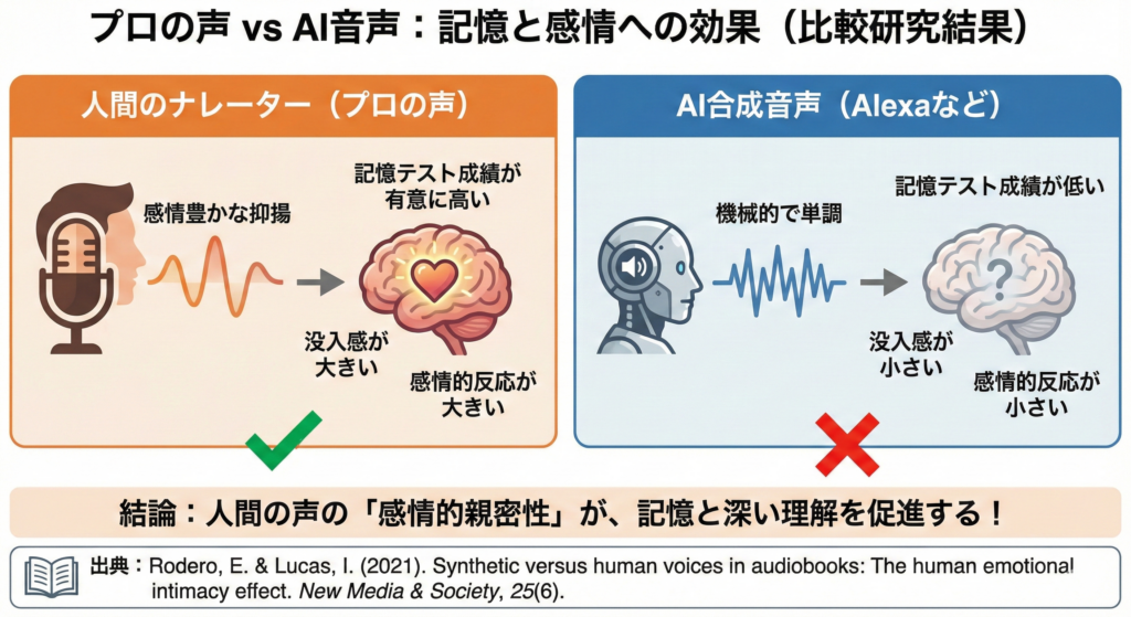 📖 出典:Rodero, E. & Lucas, I. (2021). Synthetic versus human voices in audiobooks: The human emotional intimacy effect. New Media & Society, 25(6).