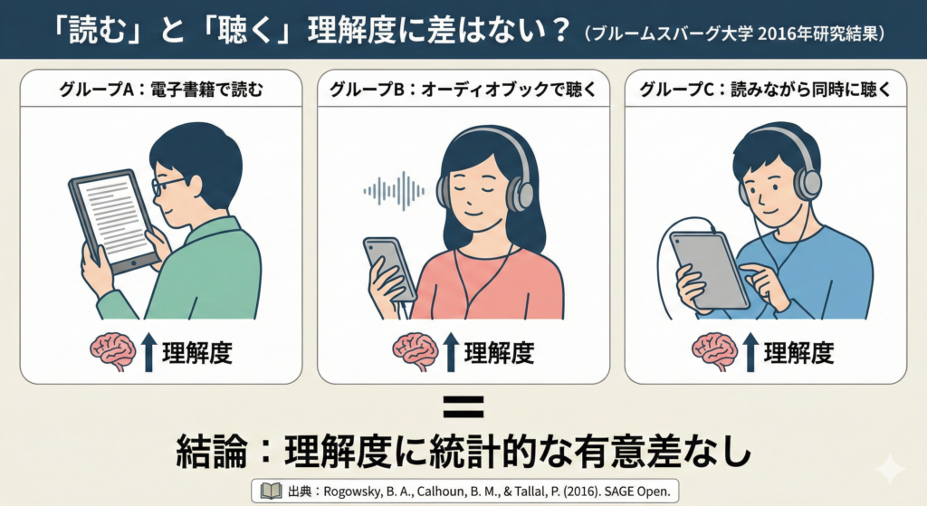 📖 出典:Rogowsky, B. A., Calhoun, B. M., & Tallal, P. (2016). Does Modality Matter? The Effects of Reading, Listening, and Dual Modality on Comprehension. SAGE Open, 6(3).