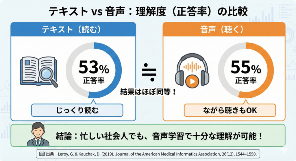 📖 出典:Leroy, G. & Kauchak, D. (2019). A comparison of text versus audio for information comprehension. Journal of the American Medical Informatics Association, 26(12), 1544–1550.